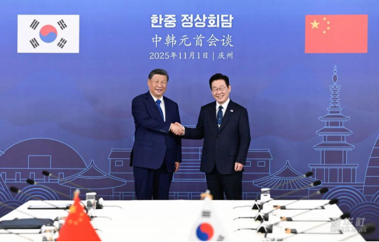 当地时间11月1日下午,韩国总统李在明同中国国家主席习近平在庆州博物馆举行会谈。